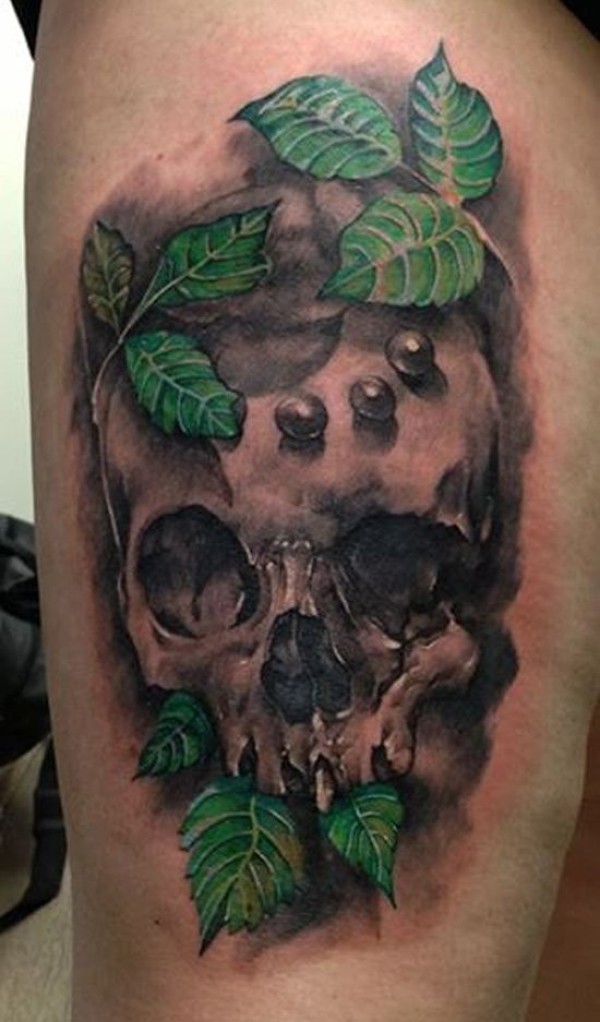 腿部壮观的现实主义风格彩色骷髅纹身图案