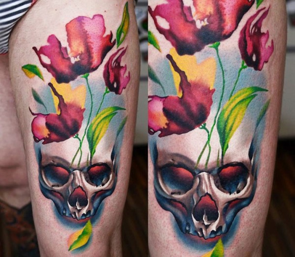 女性腿部令人惊叹的恶魔头骨纹身图案