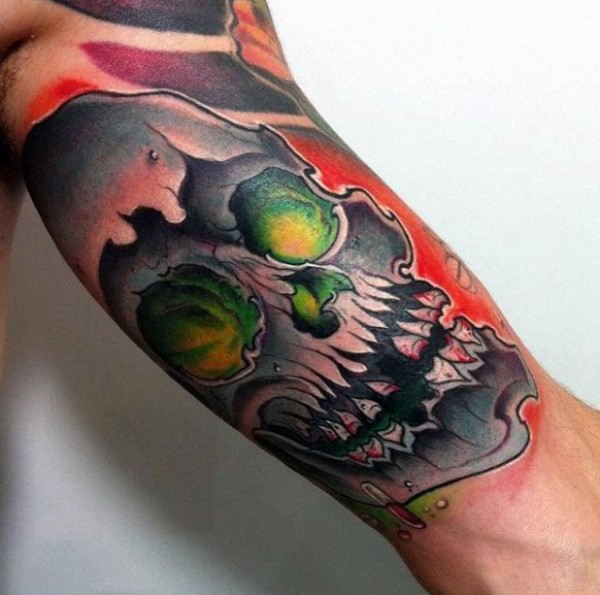 手臂漫画风格的彩色骷髅纹身图案