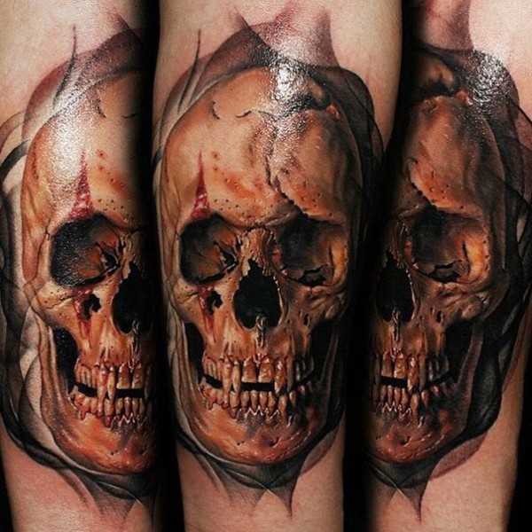 手臂写实风格彩色血腥古老骷髅头纹身图案