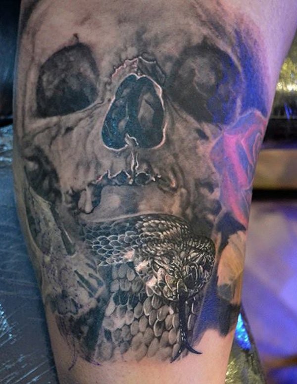 手臂黑灰骷髅头与蛇纹身图案