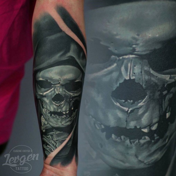 手臂现实主义风格的彩色骷髅罩纹身图案
