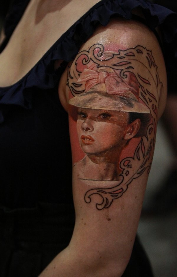 肩部彩色3D奥黛丽·赫本肖像纹身图案