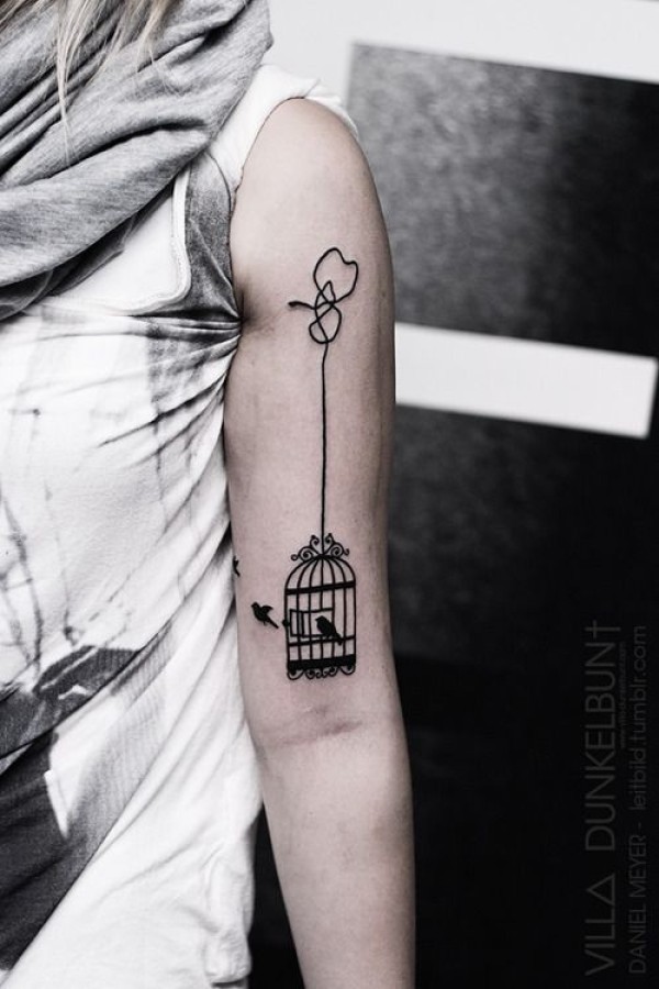 肩部黑色墨水简单鸟笼纹身图案