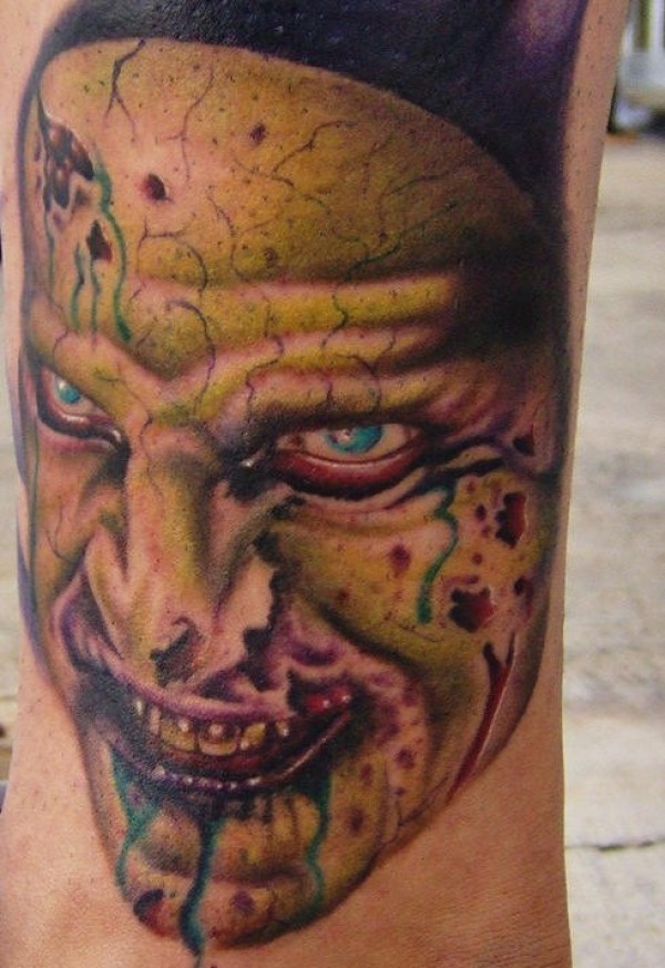 腿部彩色僵尸脸纹身图案
