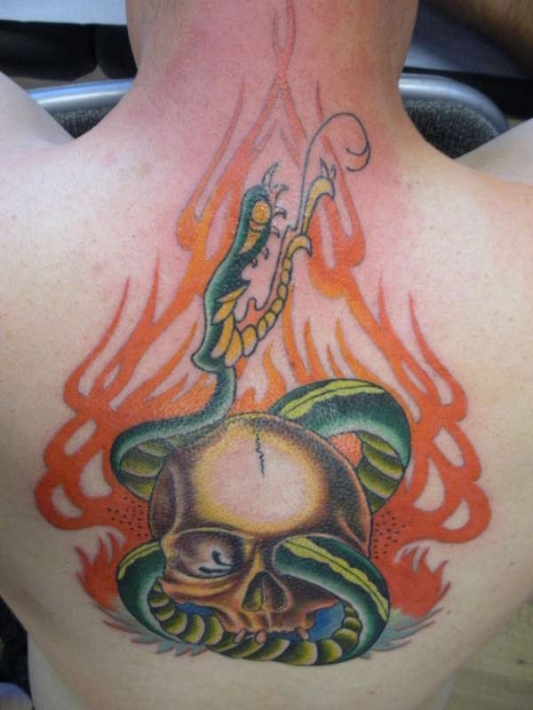 背部彩色骷髅蛇纹身图案