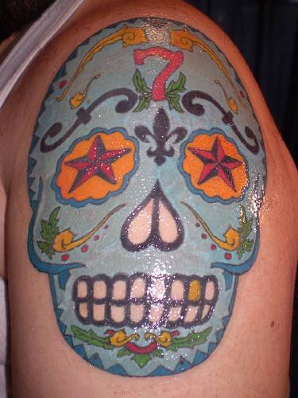 肩部彩色骷髅纹身图案