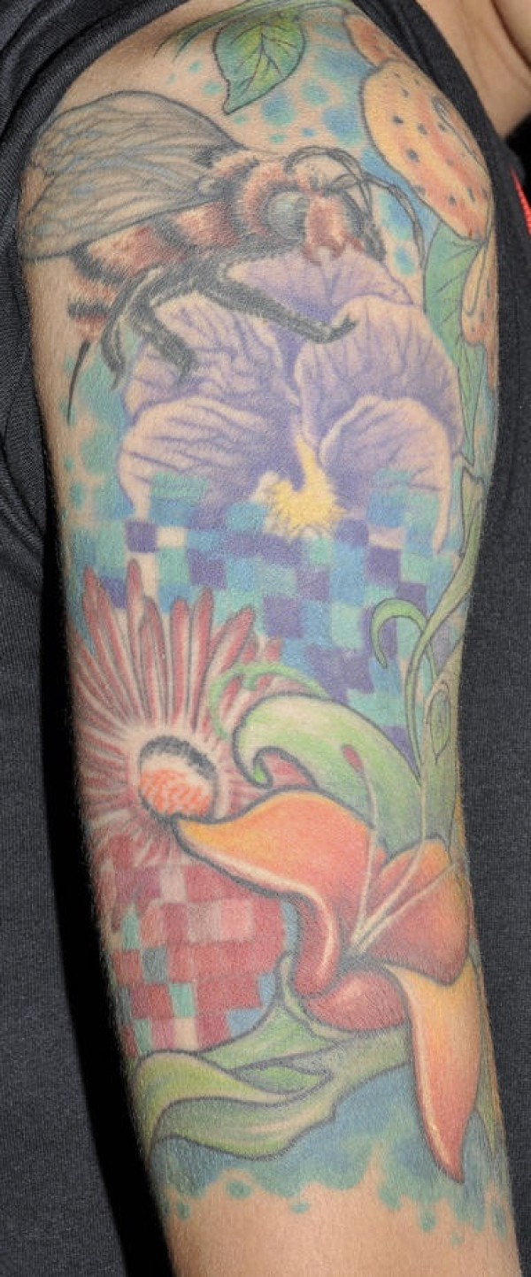 手臂彩色植物蜜蜂纹身图案