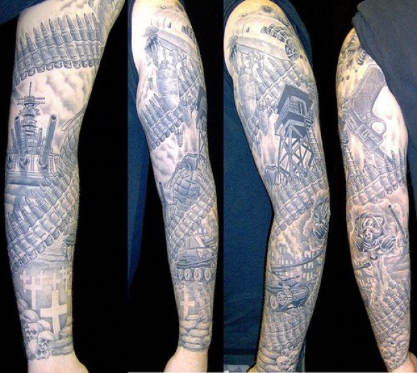 花臂黑白战争主题纹身图案
