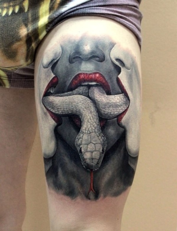 腿部彩色妇女与蛇纹身图案