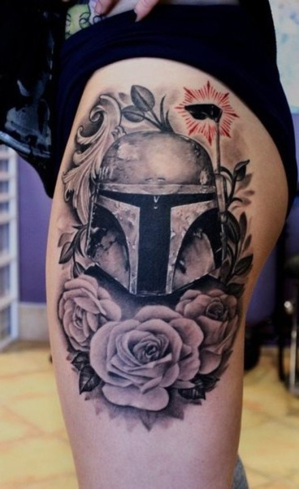 大腿黑灰纹星球大战士兵与鲜花纹身图案