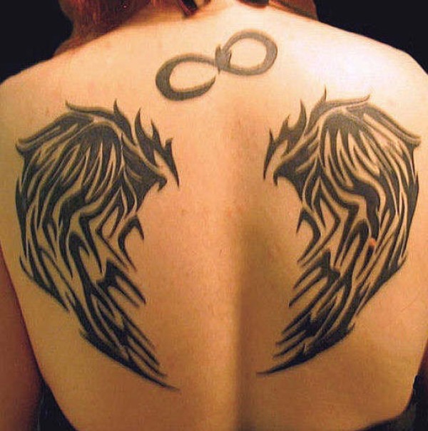 背部无限符号和翅膀纹身图案
