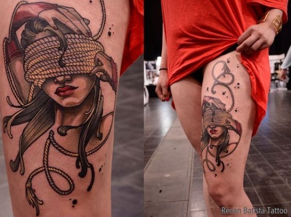 腿部蒙眼睛的女人纹身图案