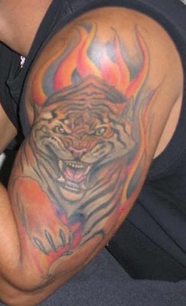 手臂彩色愤怒的老虎纹身图案