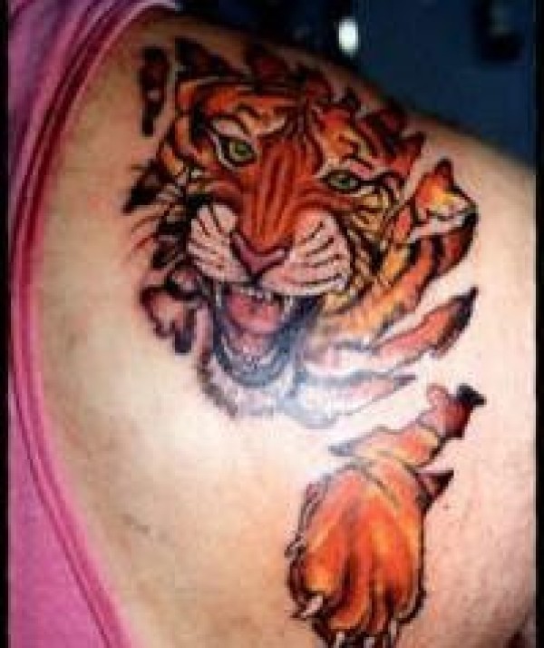 肩部彩色老虎纹身图案