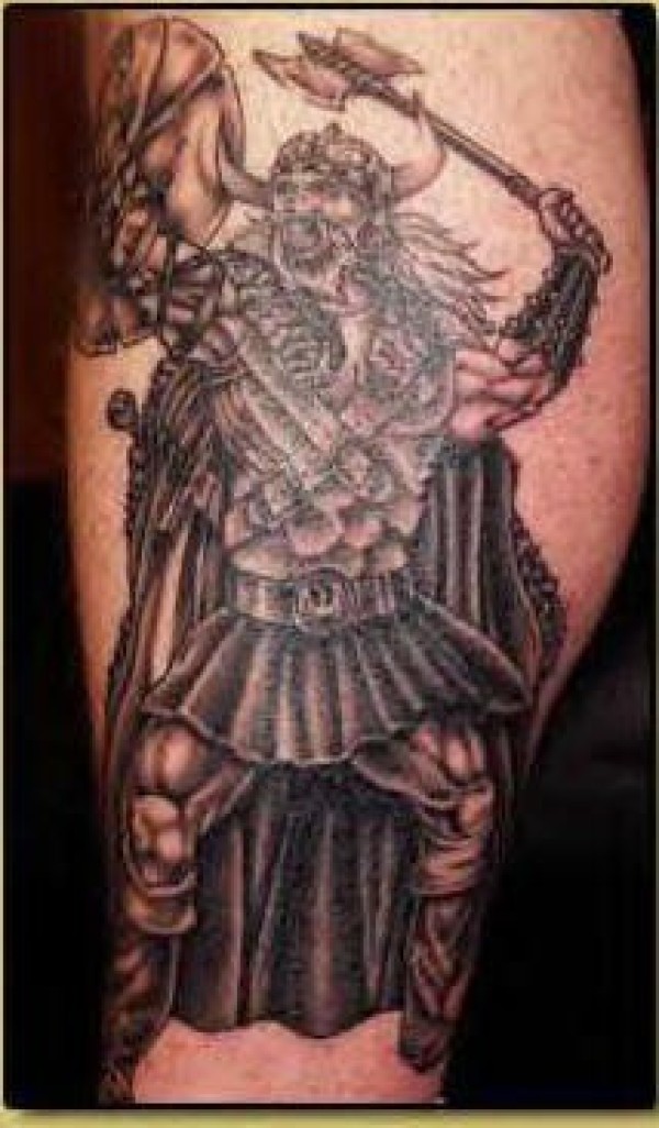 腿部黑白维京战士纹身图案