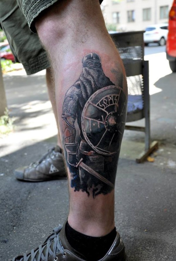 腿部战士盾牌纹身图案