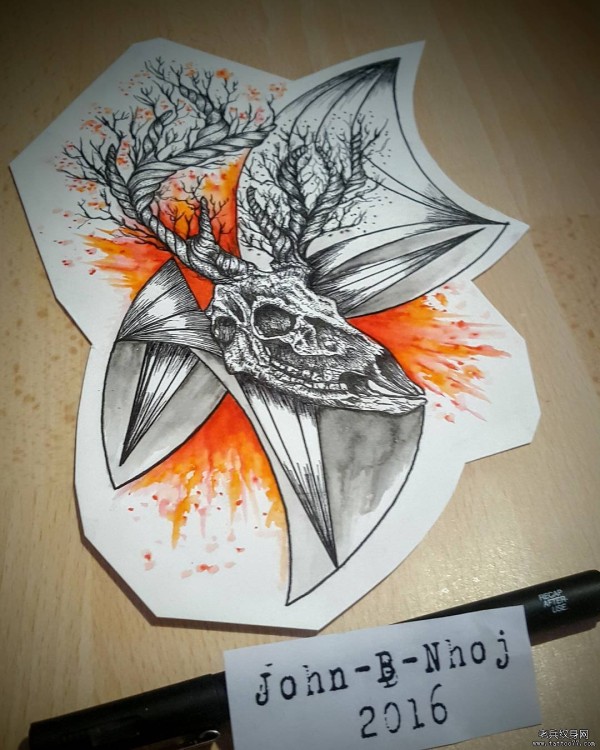 欧美线条点刺骷髅鹿水彩泼墨纹身图案手稿