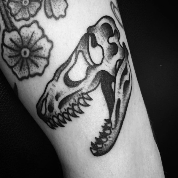 old school黑色恐龙头骨和花朵手臂纹身图案