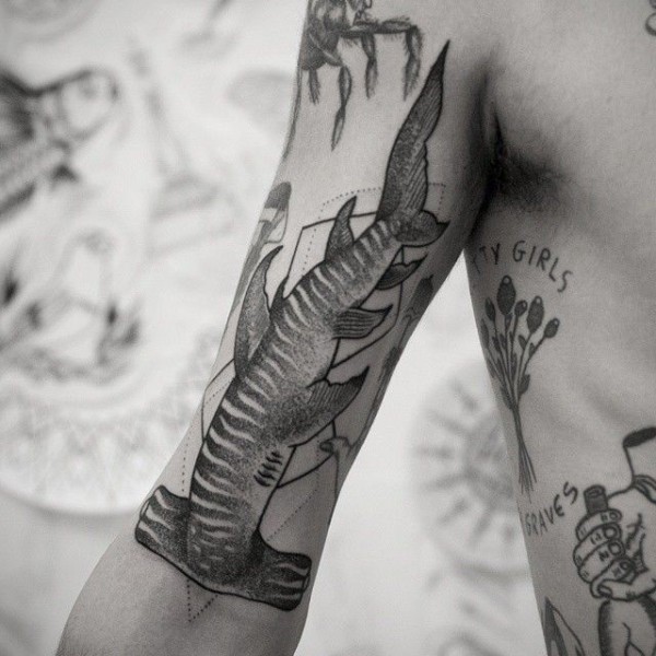 点刺风格的黑色锤头鲨手臂纹身图案