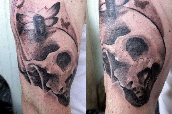 手臂壮观的黑灰风格骷髅和蝴蝶纹身图案
