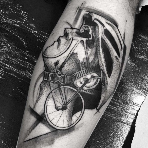 超现实主义风格的黑点刺人像与自行车头盔手臂纹身图案