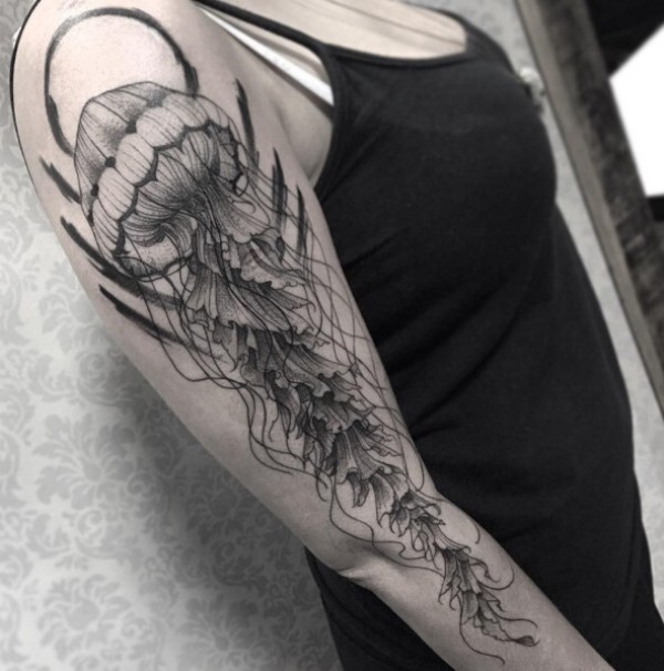 手臂雕刻风格黑色点刺水母纹身图案