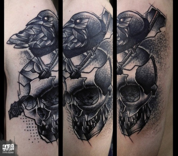 惊人的黑白点刺骷髅与乌鸦手臂纹身图案