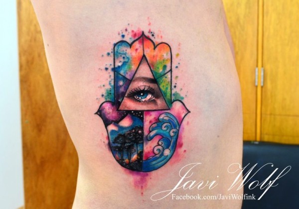 五颜六色的法蒂玛之手和神秘眼睛手臂纹身图案
