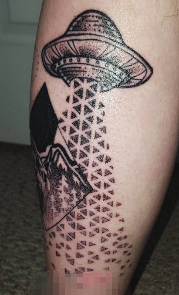 男生小腿上黑灰点刺技巧几何线条宇宙飞碟纹身图片