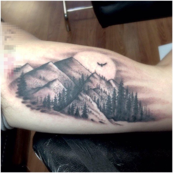 男生手臂上黑灰点刺技巧山和树风景纹身图片