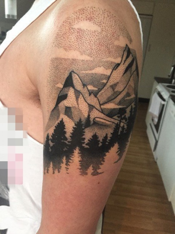 女生手臂上黑色素描点刺技巧群山纹身图案