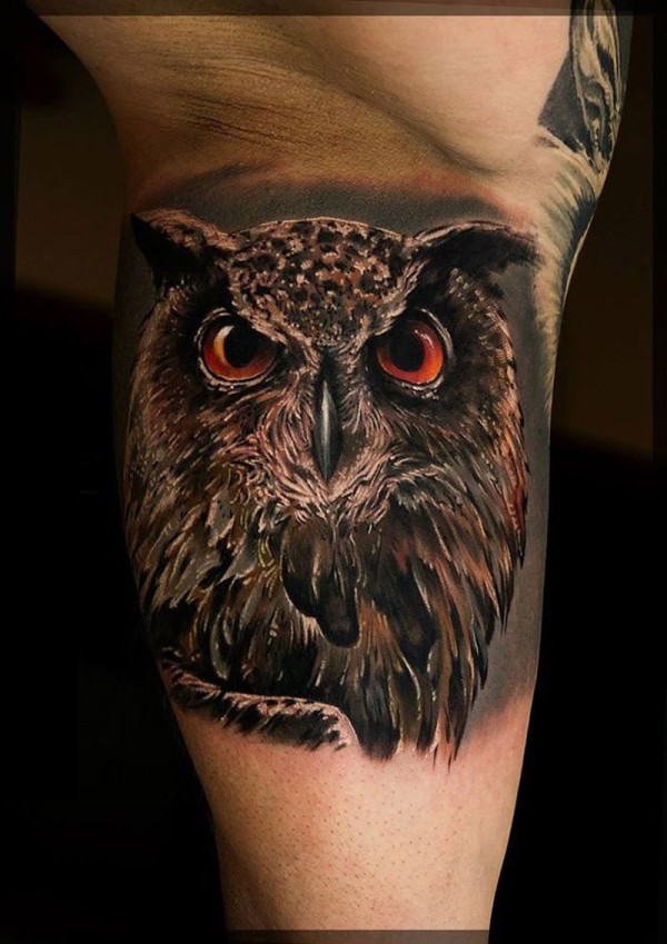 男生小腿上黑灰素描超写实3d猫头鹰纹身图片