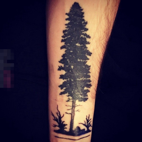 男生手臂上黑灰色清新树木纹身图片