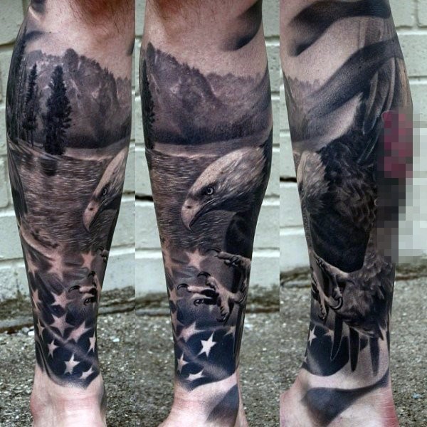 男生都喜欢的黑色素描点刺技巧霸气老鹰纹身图案