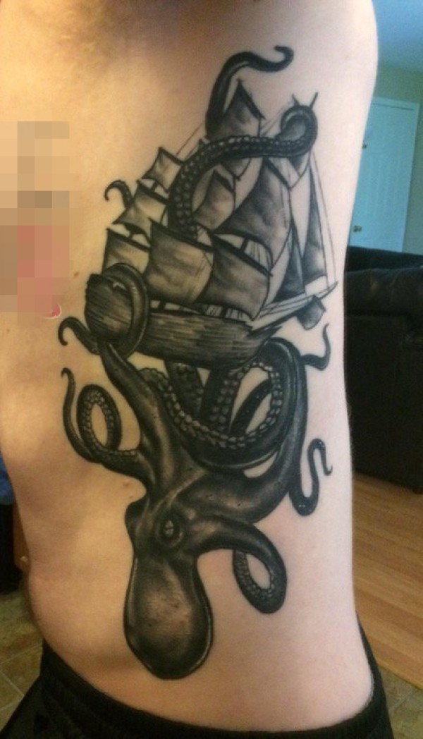 男生侧腰黑灰色素描章鱼与帆船纹身图片