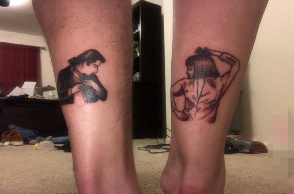情侣脚踝上黑灰色创意人物肖像纹身图片