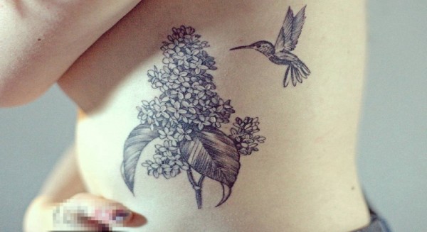 女生腰侧黑灰色简约线条花朵与蜂鸟纹身图片