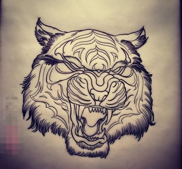 黑色线条素描创意花纹霸气老虎头纹身手稿