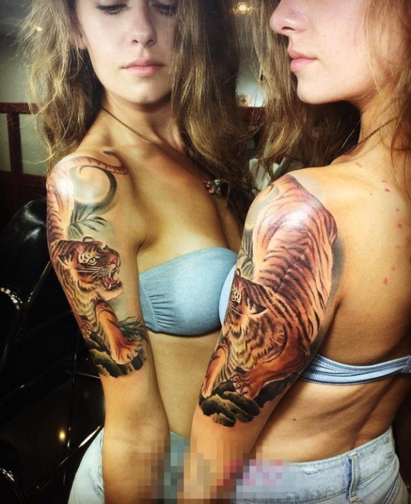 女生手臂上彩绘技巧凶猛老虎纹身图片