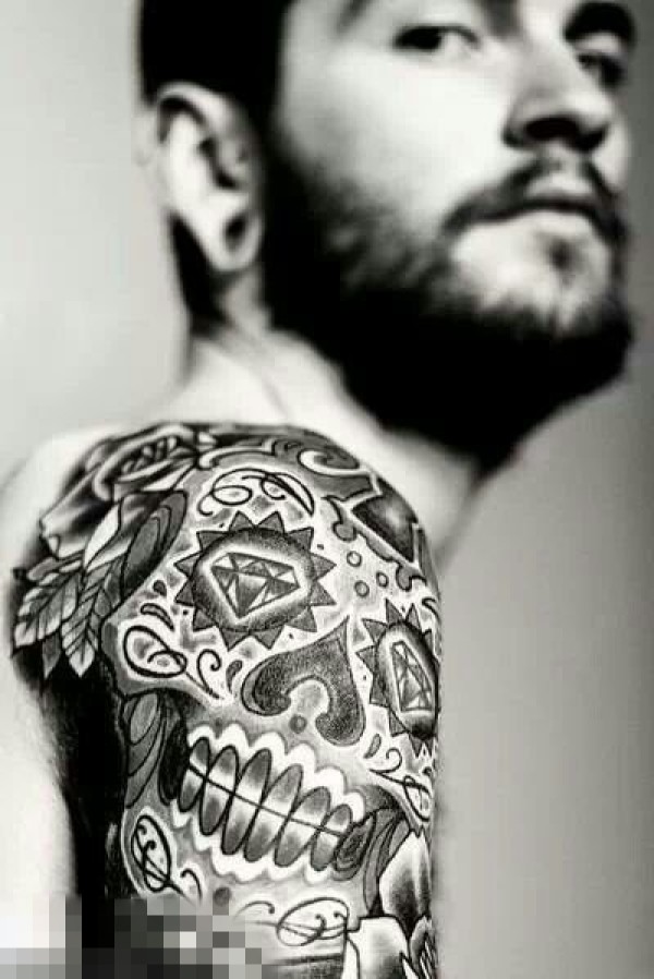 男生喜爱的黑灰点刺技巧骷髅头纹身图案