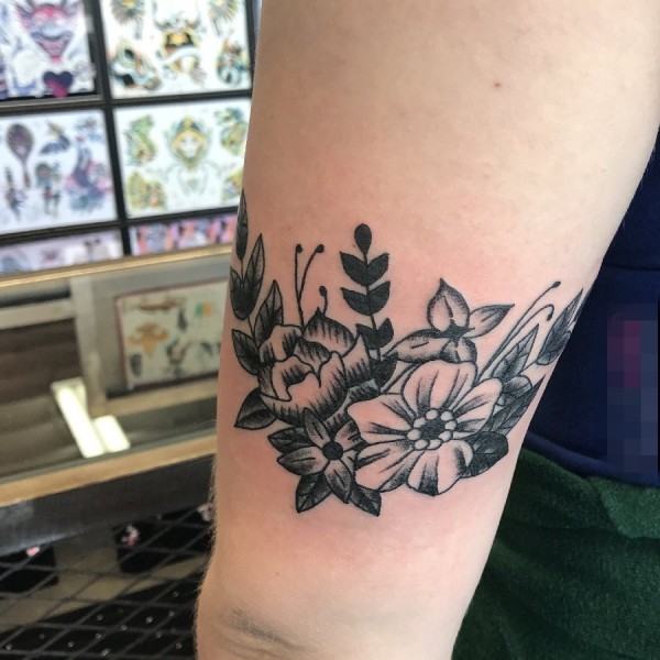 女生手臂上黑色简约线条唯美花朵纹身图片