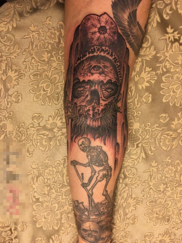 男生手臂上黑灰色素描技巧骷髅纹身图片