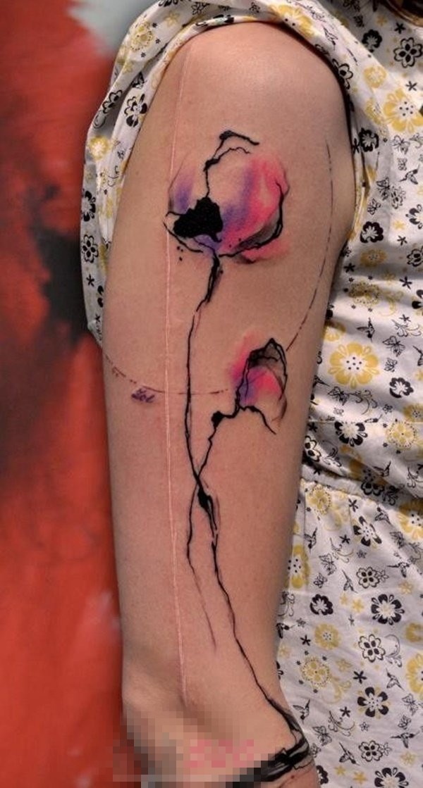 女生手臂上彩绘水墨唯美花朵纹身图片