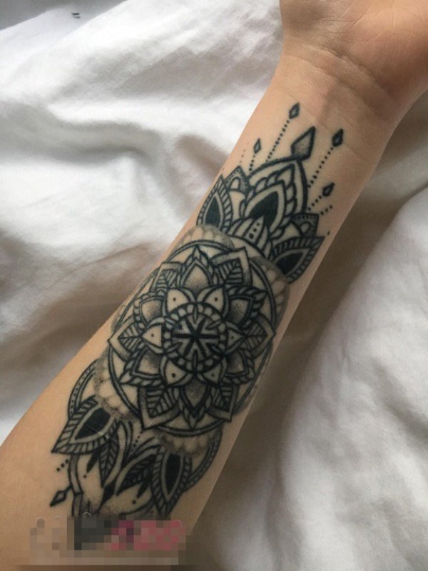 女生手臂上黑灰色几何线条唯美花纹纹身图片