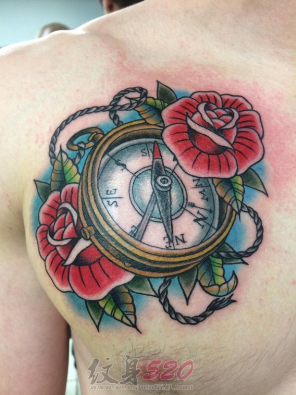 男生胸上彩绘技巧指南针与花朵纹身图片