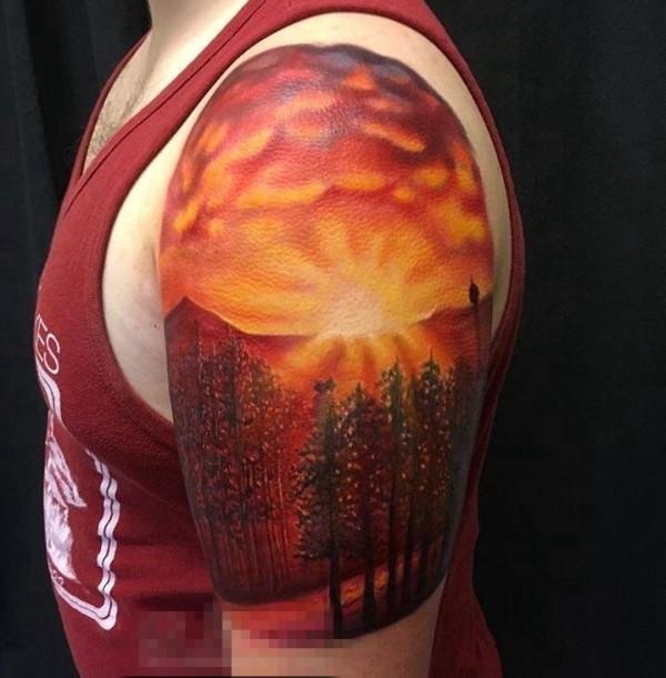 男生手臂上彩绘抽象线条树和日落风景纹身图片