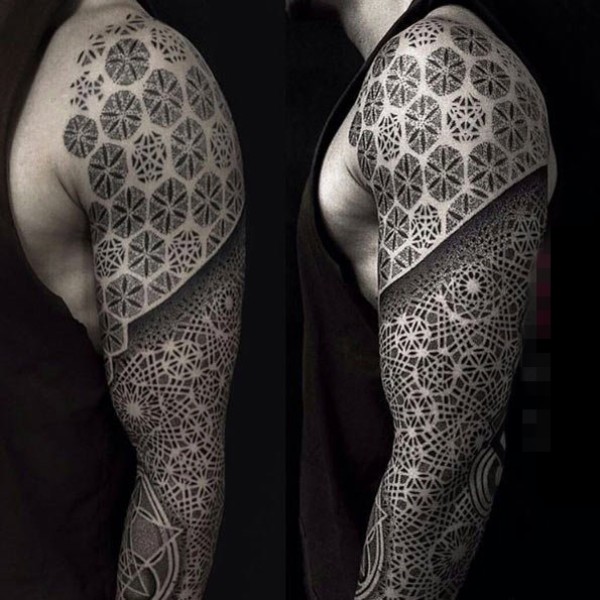 男生手臂上黑色线条素描点刺技巧花臂纹身图案