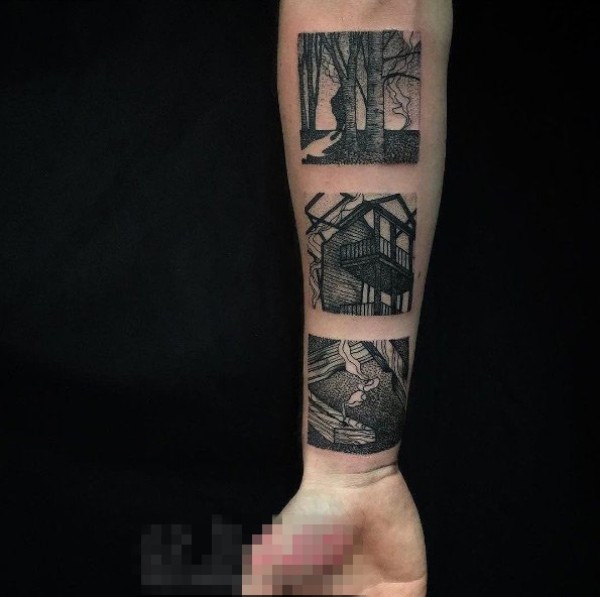 男生手臂上黑色线条素描点刺技巧花臂纹身图案