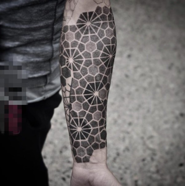 男生手臂上黑色线条素描点刺技巧花臂纹身图案